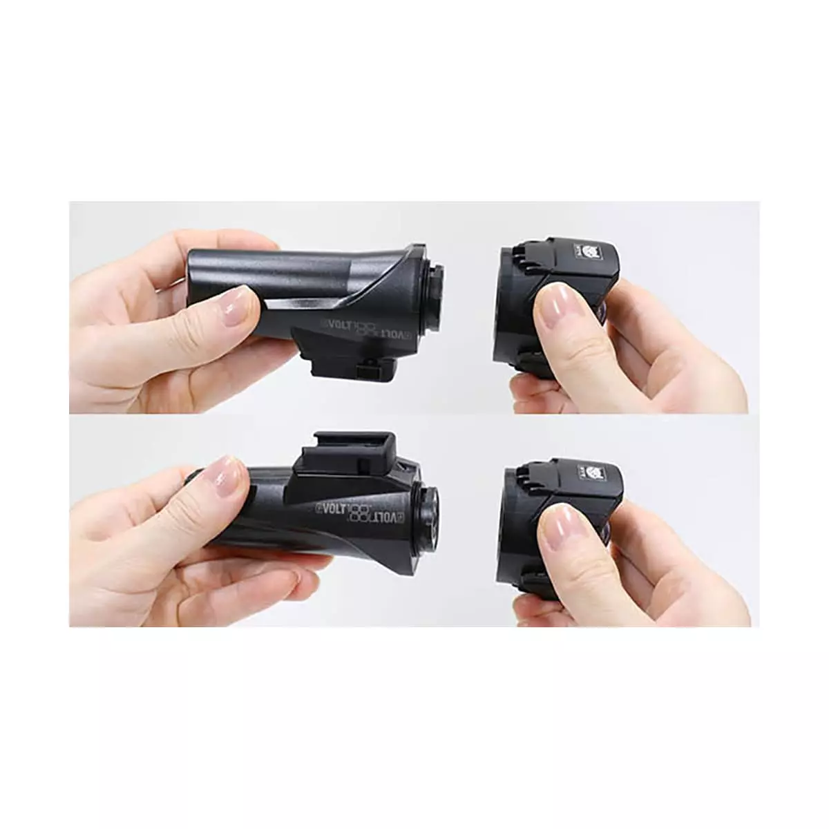 One light, two systems – the GVolt 100™ is a front lamp from Cateye’s modular lighting system. The lamp head can be removed from the battery module without tools and rotated to mount the headlight either above or below the handlebar. This ensures an optimal light field close by, in the distance, and on the sides, without blinding oncoming traffic.