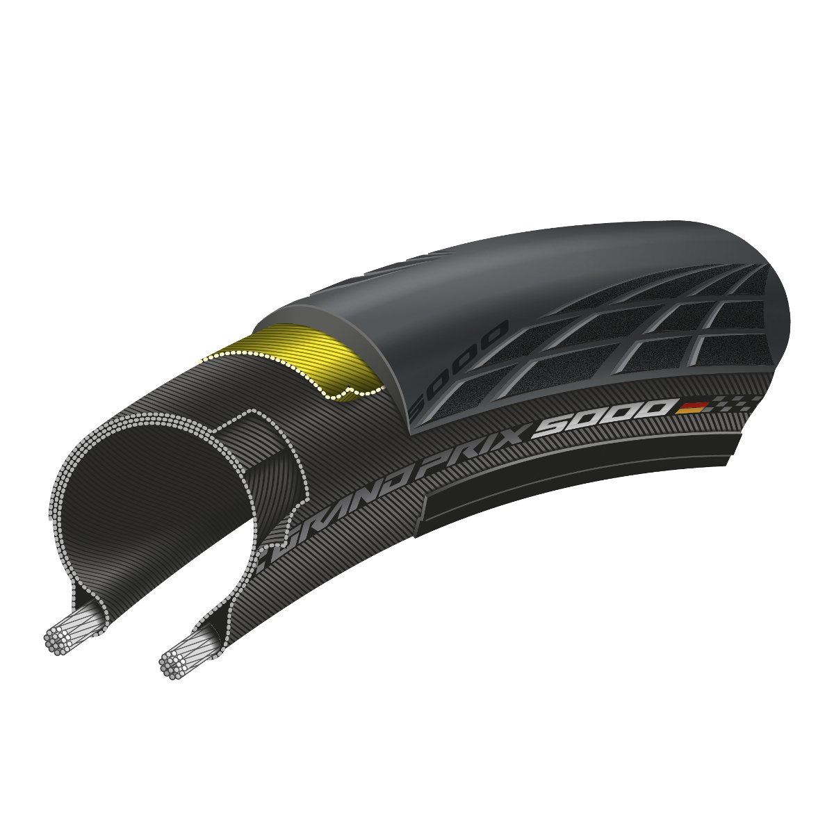 High grip and low rolling resistance are mutually exclusive. Combining both always requires a compromise. For the Grand Prix 5000, Continental has improved the composition of the well-known Black Chili compound to achieve an optimal balance of stiffness and stability – for a tyre that is optimised for low rolling resistance while being soft enough to offer maximum traction.