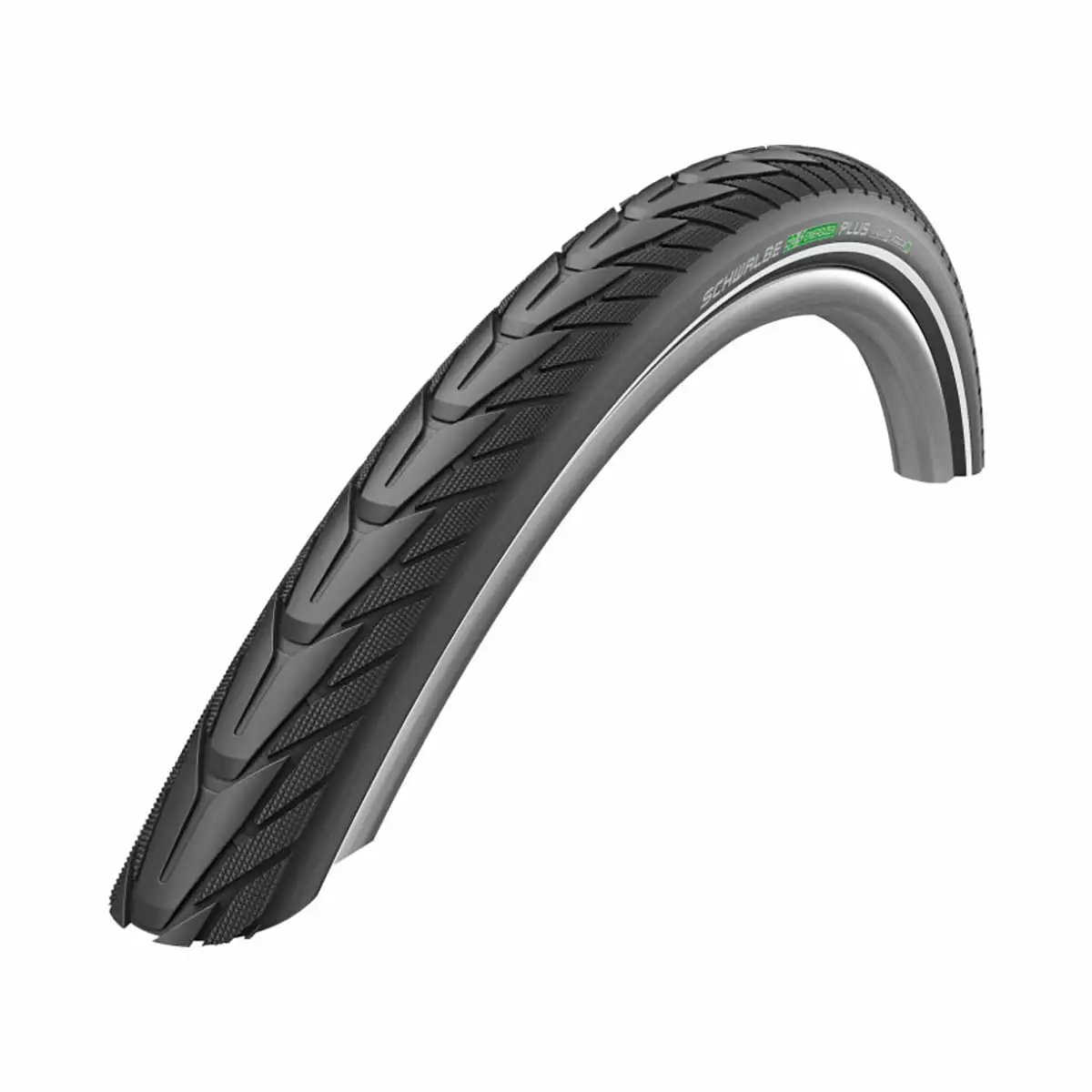The Schwalbe Energizer Plus Performance tyre has a modern, dynamic touring tread with a smooth center section and strong diamond sides. It rolls easily on the road and has good grip, even on unpaved ground.