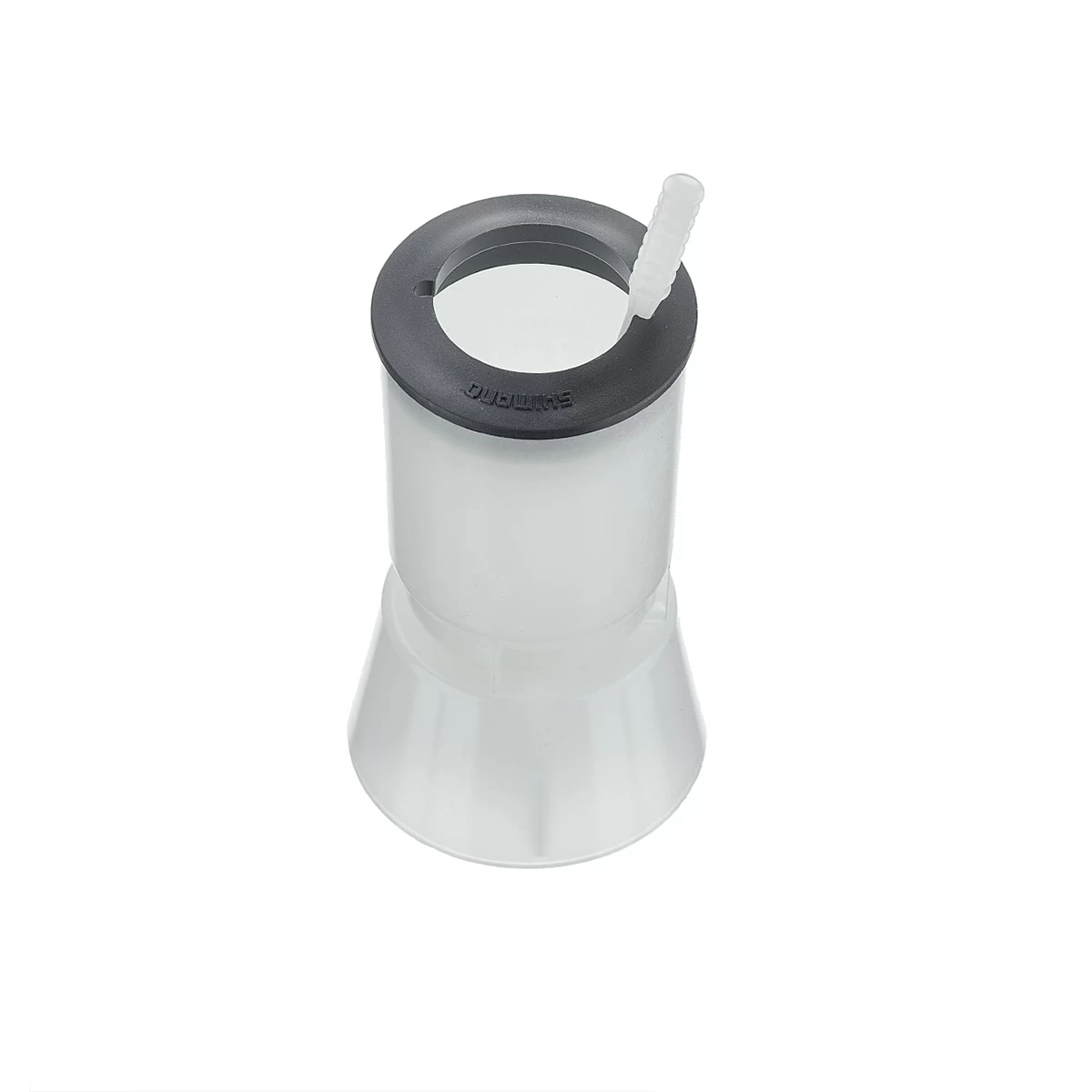 Practical oil funnel by SHIMANO for BL brake levers with M5 thread. When filling and bleeding SHIMANO MTB/hybrid disc brake systems, the screw-on attachment serves as a filling and expansion reservoir for the filled mineral oil. The oil stopper can be hooked into the funnel ring when open and plugs the fill opening with its seal after use to ensure for clean working. After use, the funnel can be placed on the base to prevent it from tipping over.