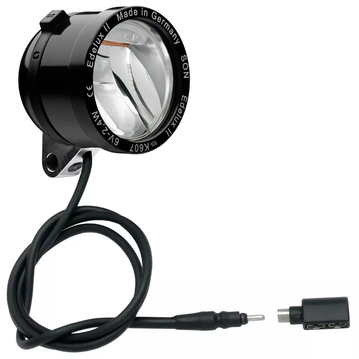 This version of the Edelux II bike light comes with a coaxial connector specifically developed by SON for easy and comfortable installation. All you need to do is fit the included coaxial adapter to the connections of your SON 28 or SONdelux hub dynamo. Then plug the connector of the integrated coaxial cable into the coaxial adapter and ride off!