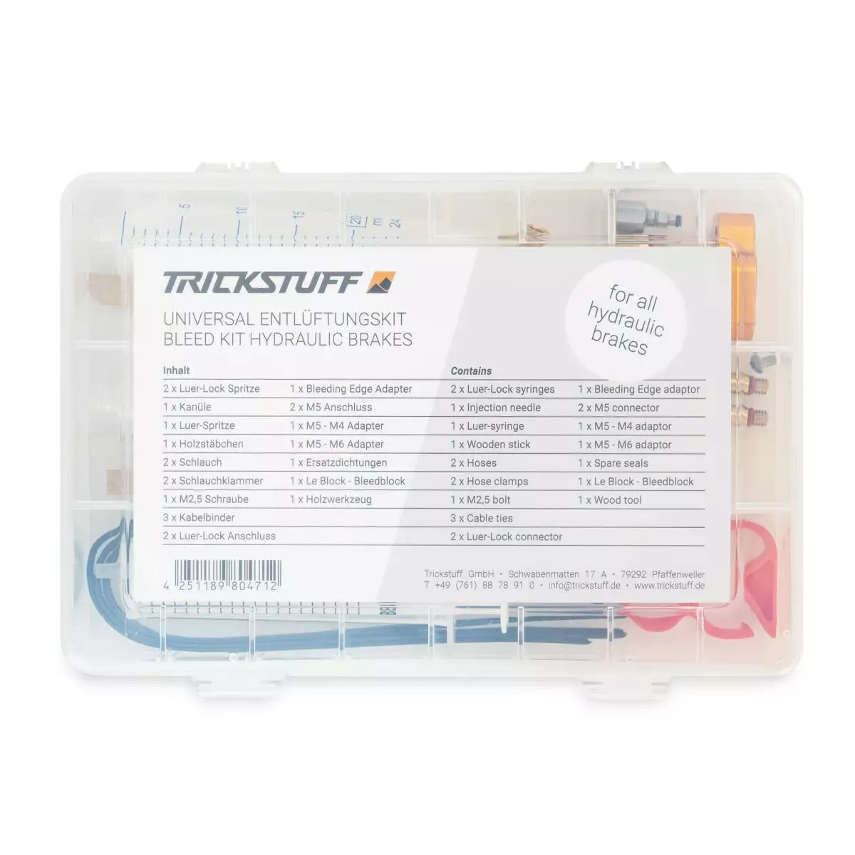 With the universal bleed kit from Trickstuff, you can maintain your hydraulic brake system like a pro. Whether DOT or mineral oil, in the practical storage box you will find all syringes, hoses, adapters and tools you need for professional bleeding of current hydraulic disc brake systems. All parts are neatly arranged in compartments so you’ll always have them ready at hand.