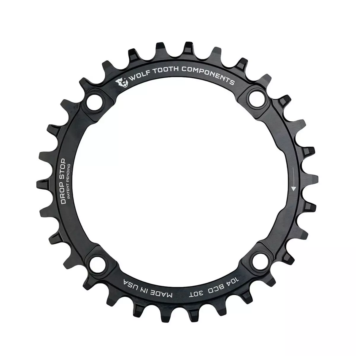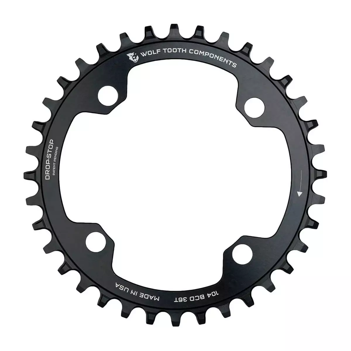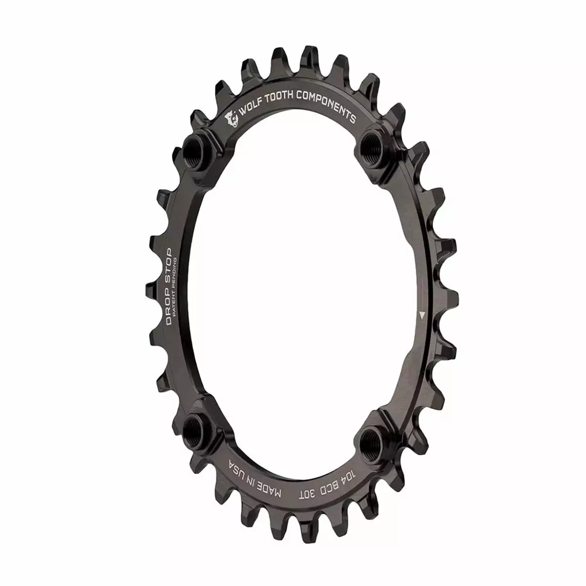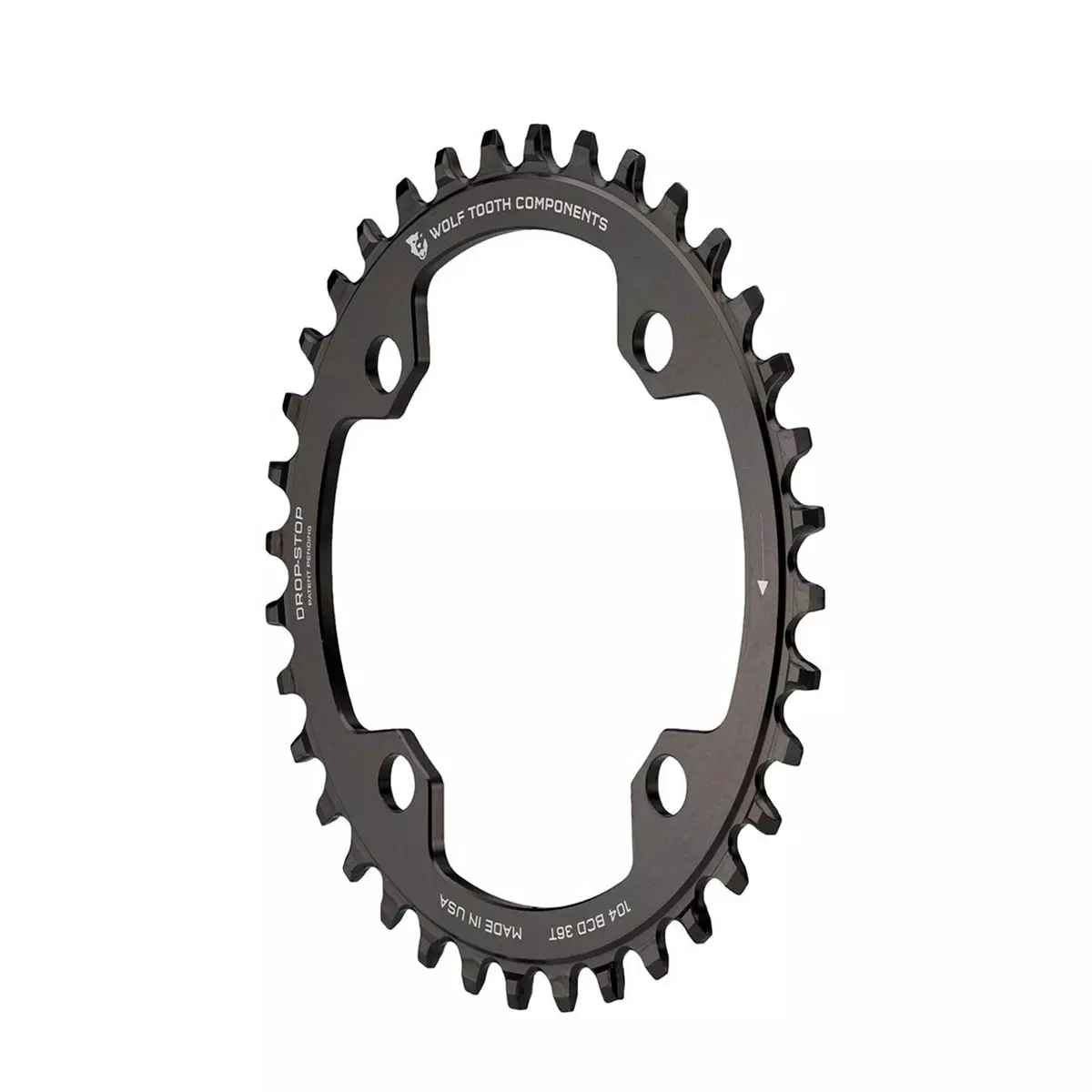 The 104 BCD chainring by Wolf Tooth fits any crankset with symmetric 104 mm bolt circle and uses the proven Drop-Stop® Technology.